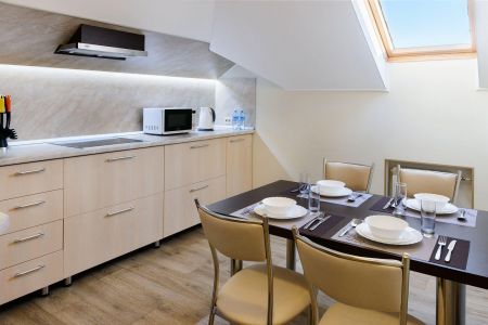 2 основных места.Двухкомнатные апартаменты с кухонной зоной, с видом на море.Апартаменты с видом на мореВ номере имеется: кухня, кондиционер, ЖК телевизор, холодильник, личная ванная комната со средствами гигиены, набор для чая, фен, тапочки, WiFi.В номерах осуществляется уборка по требованию гостей.Смена постельного белья и полотенец 1 раз в три дня.В номере можно разместить двух дополнительных гостей (раскладной диван).